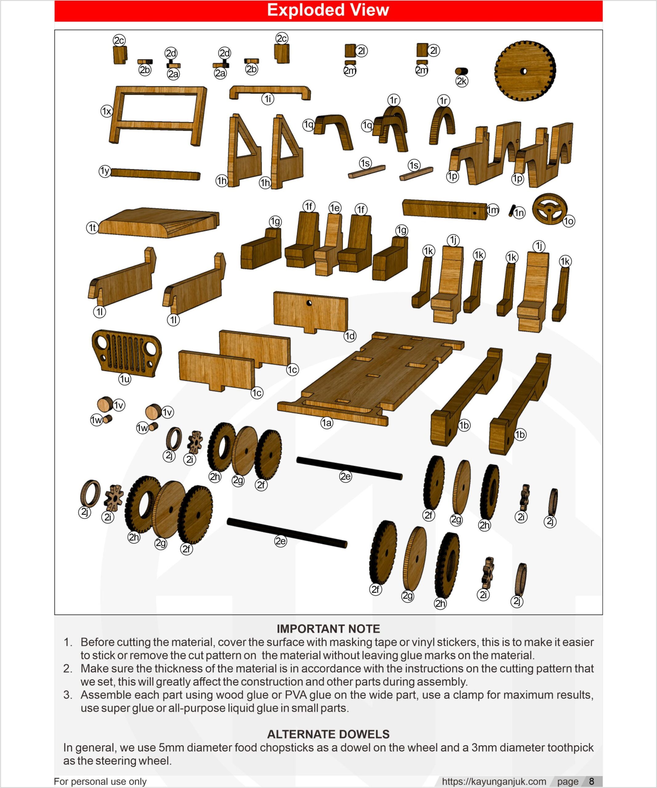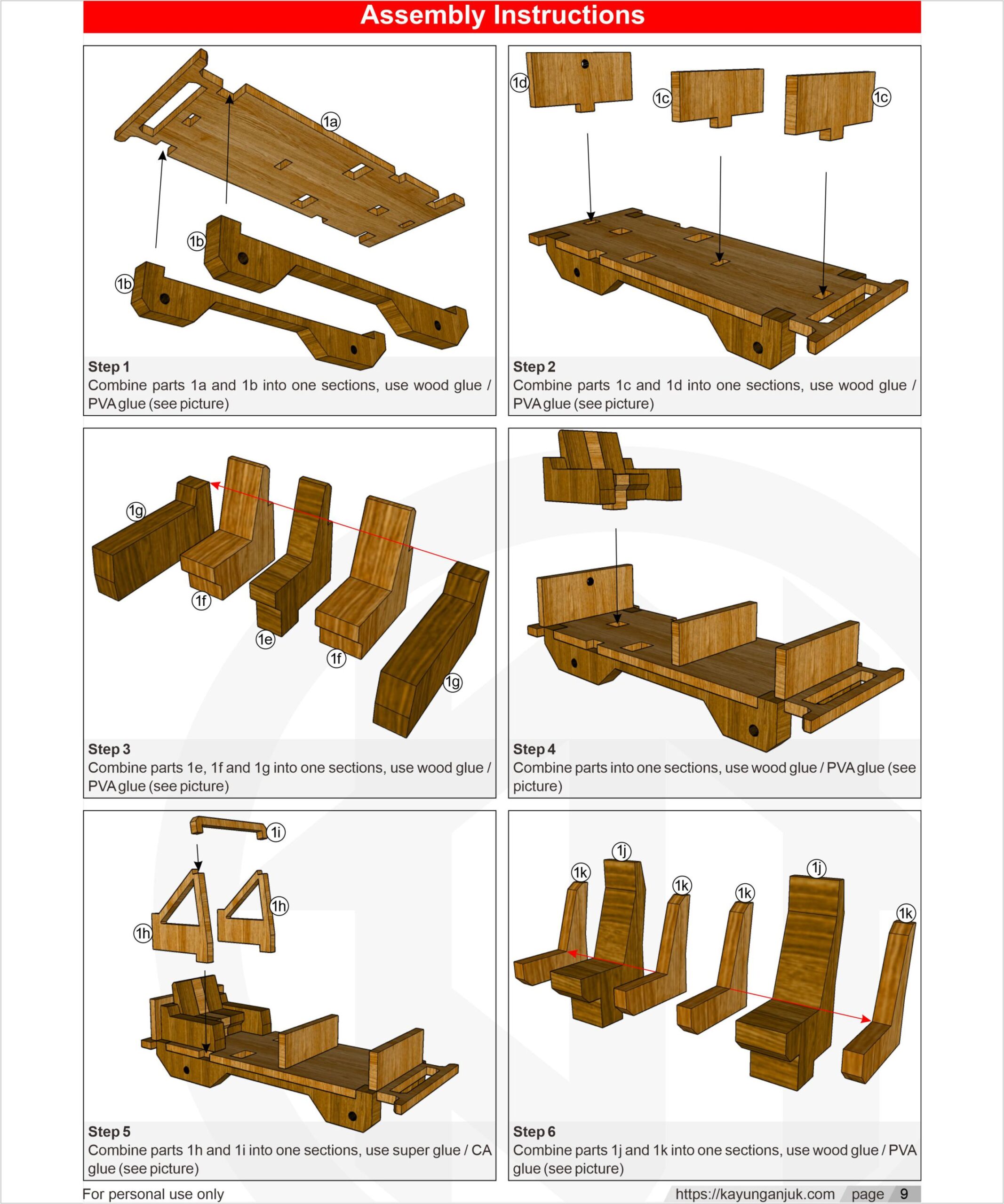 - Assemble each part using wood glue or PVA glue on the wide part, use a clamp for maximum results, use super glue or all-purpose liquid glue in small parts.